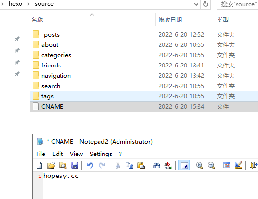 hexo设置CNAME。在 hexo 项目下,source文件夹下面创建CNAME 文件(没有后缀名的),在里面写上购买的域名。