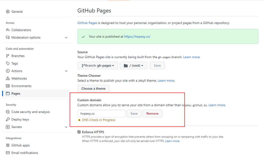 GitHub Pages的Custom domain设置里填上购买的域名。(其他平台coding,gitee类似)