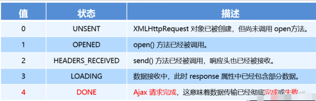 XMLHttpRequest对象的 readyState 属性,用来表示当前 Ajax 请求所处的状态 。每个 Ajax 请求必然处于以下状态中的一个: