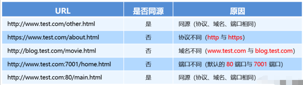 同源指的是两个 URL 的协议、域名、端口一致,反之,则是跨域 。出现跨域的根本原因: 浏览器的同源策略不允许非同源的 URL 之间进行资源的交互。