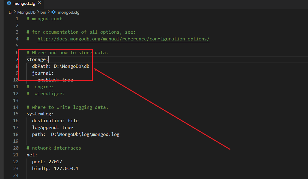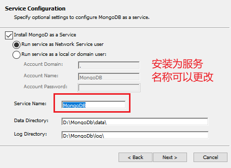 注意:我们安装的时候勾选了注册为服务,只有注册了服务才能用net start mongodb的方式启动,否则只能在命令行启动mongod -dbpath "D:\MongoDb\data\db"可以跟很多启动参数。安装时也可以不勾选,然后手动注册服务,命令如下所示。