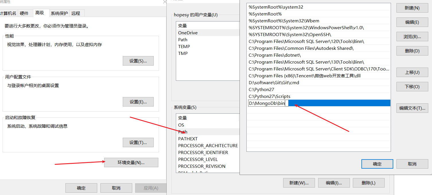 为了方便启动,我们将bin目录放在系统环境变量中,这样无论在任何目录启动Bash或者cmd都可以直接使用mongo命令。