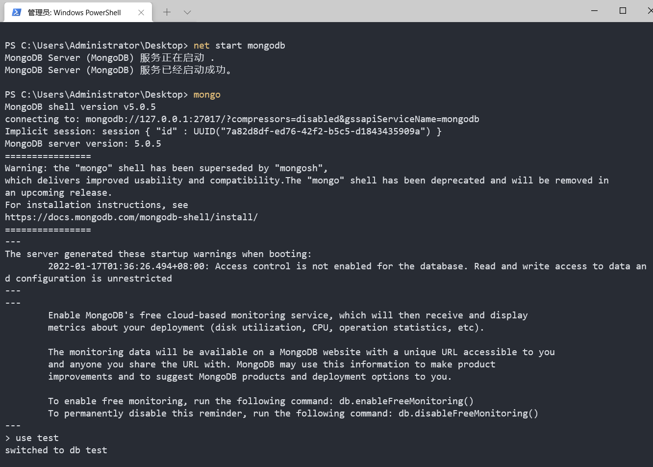 mongo命令进入数据库了,默认已经建了个表test。(我们上一步已经将bin目录添加到系统变量了,所以可以直接使用)
