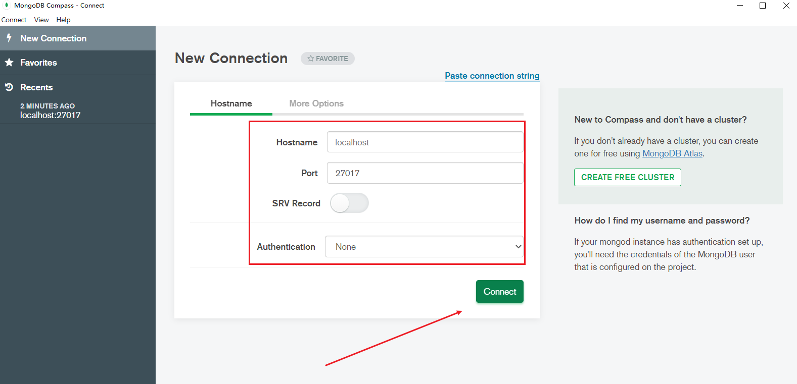 net start mongodb启动数据库后,点击fill in connection填写网址端口connect即可连接。